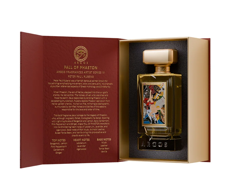 Inspired by the tragic legend of Phaeton, this bold fragrance mirrors his descent with intense notes that capture his fateful journey. It opens with the electrifying brightness of bergamot and lemon, mingling with spicy cardamom and pink peppercorn to convey the thunderous energy of Zeus’s strike. As the heart reveals itself, smoldering labdanum, aromatic lavender, and rich agarwood envelop you in an earthy warmth, symbolizing Phaeton’s fiery fall from grace. The base—anchored by dark leather, musk, sweet tonka bean, and vanilla—invokes a sense of daring and defiance, embodying a tale of ambition met with ruin.